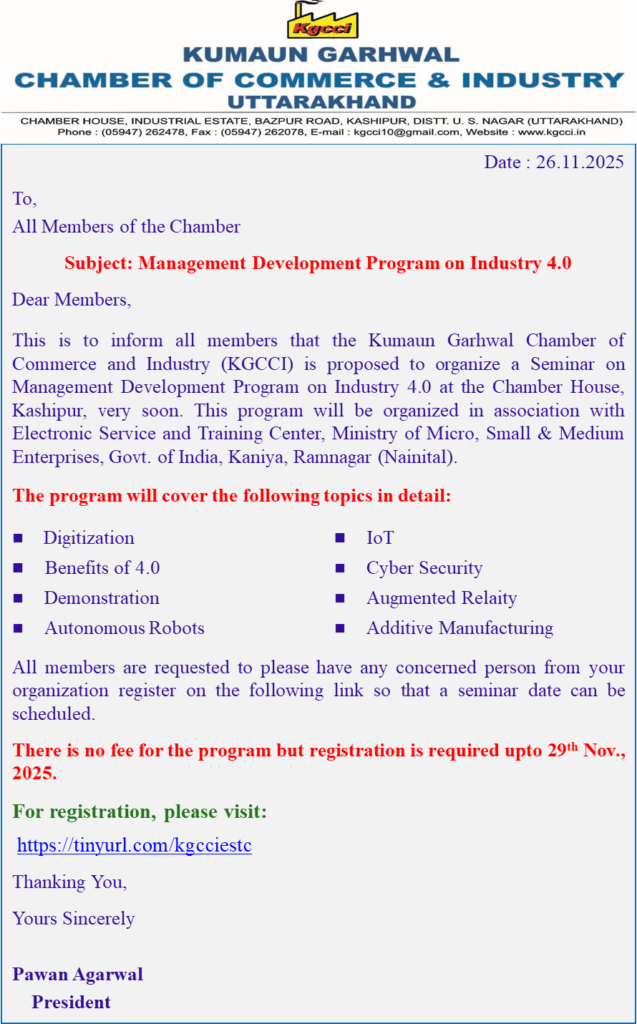 Management Development Program on Industry 4.0 Recommended Invitation to attend Outreach Program on Tax Awareness, Tax Compliance, Advance Tax and Other Important Aspects by Income Tax Department, Kashipur Workshop on MSME LEAN Scheme for Industrial Efficiency Enhancement